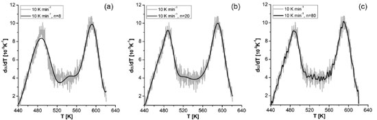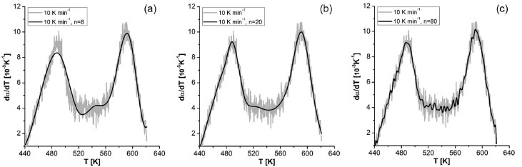 ![]() Figura 6. Suavização da curva de derivada de conversão em função da temperatura para a) 8 pontos de interrupção; b) 20 pontos de interrupção; c) 80 pontos de interrupção na taxa de aquecimento de 10 K min-1