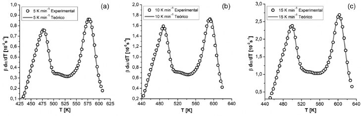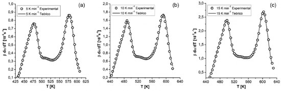 ![]() Figura 7. Curvas de dados experimentais e teóricos para a taxa de aquecimento de a) 5 K min-1; b) 10 K min-1 e c) 15 K min-1