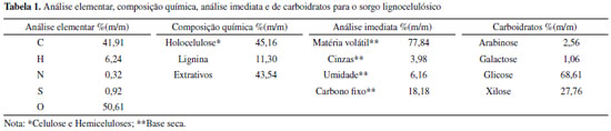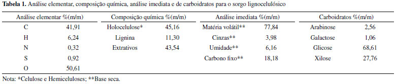 PARTE EXPERIMENTAL Amostragem e preparação do material O sorgo lignocelulósico híbrido, que foi desenvolvido na Monsanto foi utilizado nos testes termogravimétricos de pirólise. O colmo de sorgo foi primeiramente cortado em tamanhos de 20 cm e então moído em uma operação manual a fim de remover a grande parte de suco presente no material. O material foi então seco em um forno de circulação de ar por 24 h a 378 K, depois foi processado em um moinho de facas para posterior classificação granulométrica. O material utilizado nas análises termogravimétricas foi a fração passante por peneira de 100 mesh. A utilização de partículas nessa granulometria busca minimizar a resistência à transferência de massa e de calor durante a análise.3 As análises de caracterização da biomassa, análise elementar, composição química, análise imediata e de carboidratos para o sorgo lignocelulósico foram realizadas em trabalho prévio,3 e os resultados são mostrados na Tabela 1.