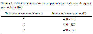 Os intervalos de temperatura utilizados para cada taxa de aquecimento são mostrados segundo a Tabela 2.