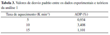 Com a utilização de pontos de interrupção (n) igual a 8, a curva suavizada apresenta altura de picos diferentes da curva experimental. Para n = 20, a curva suavizada representa de maneira eficiente os dados experimentais. Para n = 80, a curva suavizada apresenta ruídos e não é adequada para a representação dos dados experimentais. Dessa maneira, após análise dos desvios entre curva experimental e curva suavizada foi utilizado o número de pontos de interrupção igual a 20, considerando a taxa de aquecimento de 10 K min-1. Comparação entre os dados experimentais e teóricos O cálculo para os dados teóricos de derivada de conversão em função da temperatura foi realizado pelo método de Runge-Kutta, segundo a equação 4. Os dados experimentais, ou seja, derivadas de conversão em função da temperatura após processo de suavização, foram comparados aos dados teóricos utilizando as equações 5 e 6, obtendo-se os valores de ADP. Os valores de conversão utilizados para essa comparação foram do intervalo de 0,005 até 0,995; com passo de 0,005 (para obtenção de maior detalhamento); cada valor de conversão gerado nesse novo intervalo proposto gerou um valor de energia de ativação e um coeficiente linear para cada reta. Os valores de ADP entre as os dados experimentais e teóricos para as taxas de aquecimento 5, 10 e 15 K min-1 obtidos são mostrados segundo a Tabela 3. Os gráficos de comparação entre os dados experimentais e teóricos para as taxas de aquecimento de 5, 10 e 15 K min-1 podem ser vistos na Figura 7.