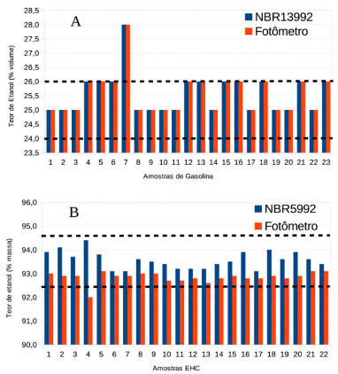 ![]() Figura 1. Comparação dos resultados das análises de (A) gasolina e (B) EHC
