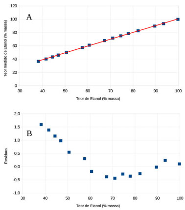 A precisão foi avaliada a partir de estudos de repetibilidade e reprodutibilidade usando o fotômetro NIR, sendo que os valores de desvio-padrão relativo calculados entre as análises não foram superiores a 0,2 e 0,4%. As normas NBR 13992 e 5992 apresentam valores de repetibilidade e reprodutibilidade semelhantes, 0,4 e 0,8%, e 0,2 e 0,3%, respectivamente. Linearidade O fotômetro apresentou uma relação linear entre as medidas em etanol combustível com soluções padrão com teor de etanol entre 36-99,7% (m/m), conforme ilustra a Figura 2A. O coeficiente de determinação calculado foi superior a 0,999 e com raiz quadrado do erro quadrático, RMSEV, menor que 1% entre os teores de etanol das soluções padrão e as medidas.