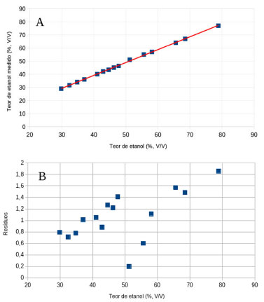 ![]() Figura 2. Estudo de linearidade com soluções padrão de etanol: (A) curva de calibração com R2 = 0,9994 e (B) gráfico de resíduos com RMSEV(%)= 0,8