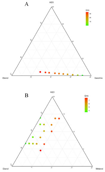 Seletividade O fotômetro foi avaliado por sua seletividade através de medidas de soluções padrão preparadas com gasolina tipo C e EHC, e soluções padrão de etanol, metanol e água. A Figura 4 apresenta diagramas ternários com coloração nos pontos representando o erro relativo das medidas de teor de etanol nos dois experimentos. Na análise do etanol em gasolina, a adição de EHC, e consequentemente, o aumento das concentrações de etanol e água nas soluções, aumenta consideravelmente o erro relativo, mesmo em quantidades pequenas, conforme ilustram a Figura 4A. Na análise de etanol em EHC, pode-se verificar que os erros relativos são maiores que 5% na presença de quantidades 10 vezes maiores de metanol permitido pela ANP.
