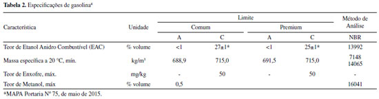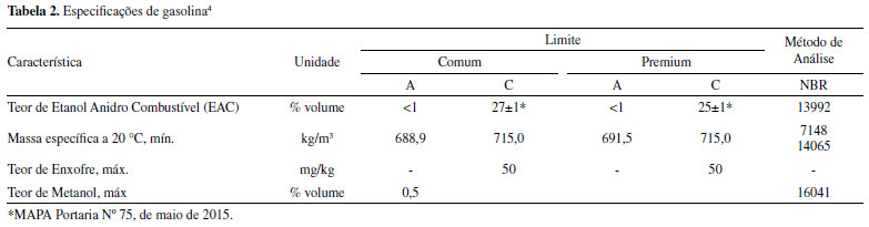 Segundo o painel dinâmico do Programa de Monitoramento de Qualidade dos Combustíveis, PMQC,2 foram registrados, neste ano, cerca de 2% de amostras de EHC não-conforme, sendo a principal característica de não-conformidade a massa específica ou teor de etanol. Essa não-conformidade pode ter origem na adição de outros solventes, como água e metanol,3 com intuito de aumentar o volume do produto comercializado. No caso da gasolina,4 a Resolução ANP Nº 807, de janeiro de 2020, estabelece as características de 4 tipos de gasolinas: gasolinas comum e premium, tipos A e C, parte apresentadas na Tabela 2.