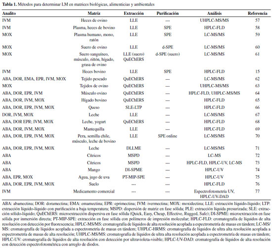 MÉTODOS DE DETERMINACIÓN DE LACTONAS MACROCÍCLICAS A la fecha, se han desarrollado numerosos métodos analíticos para la identificación y cuantificación de LM en matrices biológicas, ambientales y alimenticias. En las matrices biológicas la determinación de LM permite estudiar sus parámetros farmacocinéticos, así como la concentración plasmática y fecal para diseñar mejores planes de tratamiento farmacológico. En cuanto a las matrices alimenticias, las LM suelen permanecer por periodos prolongados y acumularse en los tejidos y órganos de los animales tratados1,38 o excretarse a través de la leche56 lo cual puede ser perjudicial para los consumidores. Además, la presencia de residuos de LM en el medio ambiente puede tener un impacto negativo ya que estos compuestos son tóxicos para organismos acuáticos y terrestres.5 En los últimos años, los métodos desarrollados se han orientado al análisis de matrices biológicas como heces, plasma, suero sanguíneo, y diferentes tejidos animales. También ha habido importantes aportes en el análisis de matrices alimenticias y ambientales. Aunque varios métodos se han desarrollado para determinar LM individuales, la mayoría son métodos multiresiduo donde se determinan dos o más LM simultáneamente (Tabla 1). En el desarrollo de nuevos métodos analíticos se ha buscado mejorar las características analíticas del método, así como el aspecto medioambiental; por lo que muchos de estos métodos se caracterizan por el uso de cantidades relativamente bajas reactivos y generar pocos residuos.