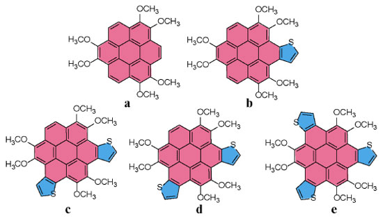 ![]() Figure 1. Molecular structures of coronene derivatives (a: coronene, b: monothienocoronene, c: dithienocoronene, d: isodithienocoronene, e: trithienocoronene)