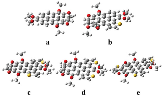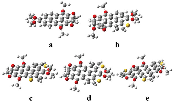 ![]() Figure 2. Optimized structures of coronene derivatives (a: coronene, b: monothienocoronene, c: dithienocoronene, d: isodithienocoronene, e: trithienocoronene) using the B3LYP/6-31++G(d,p) method