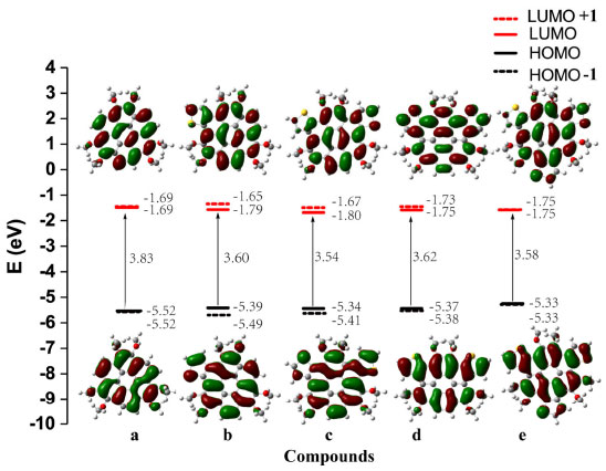 ![]() Figure 3. LUMO + 1 energies (EL+1), LUMO energies (EL), HOMO energies (EH), HOMO-1 energies (EH-1), and HOMO-LUMO gaps (Eg) of coronene derivatives a ~ e at the B3LYP/6-311++G(d,p) level. The upper illustration is the ground state density plot of the LUMO, and the bottom illustration is the ground state density plot of the HOMO of the six molecules