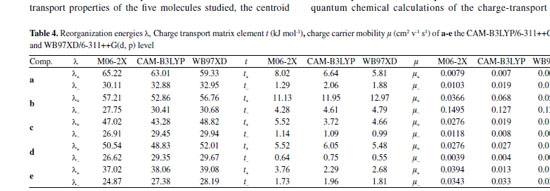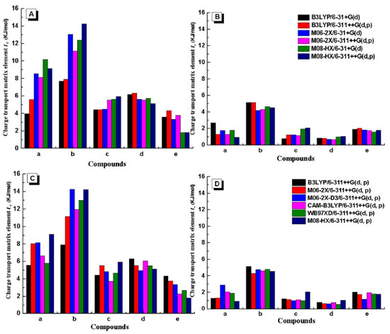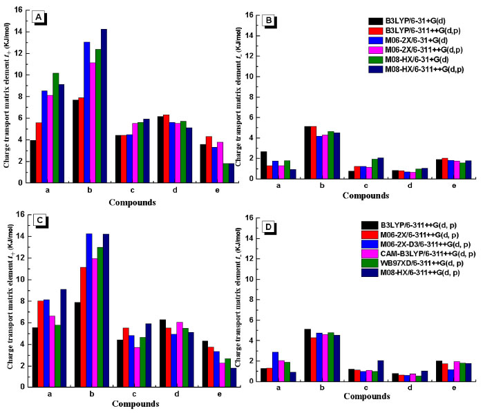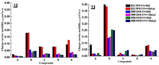 The charge-transport rate constant k and carrier mobility μ of the five molecules were calculated from Equation (6) and Equation 1, respectively. Table 5S shows the charge-transport rate constant k of the five molecules. The data indicate that introducing thiophene rings into the coronene with molecule a as the parent facilitated an increase in the charge-transport performance in all the cases. However, the charge-transport performance did not increase with the number of thiophene rings added, as the charge-transport performance did not improve significantly after adding two and three thiophene rings compared to the parent (molecule a); the orientation of the thiophene rings also had little effect on the charge-transport performance. Charge carrier mobility Table 3 and Figure 5 show the charge carrier mobility values obtained using different basis sets and different density functionals. The results show that changing the basis set did not have a significant effect on the charge carrier mobility. In addition, calculated using B3LYP were significantly larger, whereas the results of the other methods were more similar, especially those obtained using the M06 2X, CAM-B3LYP, and WB97XD functionals. This is consistent with our previous research findings.