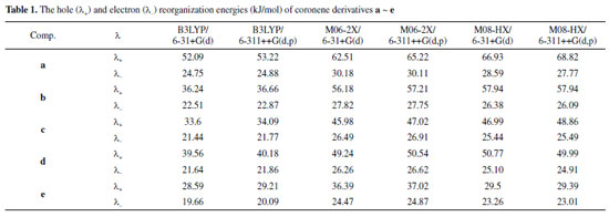 Molecular reorganisation energy Using the 6-31+G(d) and 6-311++G(d,p) basis sets, the B3LYP, M06-2X, and M08-HX density functionals were applied to optimise the calculated molecular and ionic energies, the ionic energies based on the molecular configuration, and the molecular energies based on the ionic configuration. The hole (λ+) and electron (λ-) transport reorganisation energies of the five thiophene-containing coronene derivatives were calculated using Equations (7) and (8), respectively, and are listed in Table 1, Figure 4S and Figure 5S (A and B). The difference between the hole and electron-transport reorganisation energies obtained by the same method for the different basis sets was small, thus indicating that increasing the diffuse and polarisation functions had little effect on the molecular reorganisation energies.
