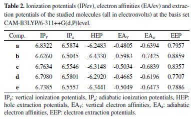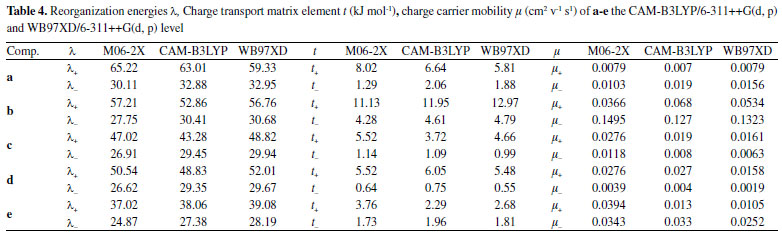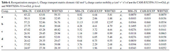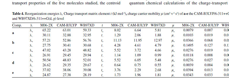 Table 4 show the charge-transport reorganisation energy, charge-transport matrix element, and charge carrier mobility of the five coronene derivatives calculated using the 6-311++G(d,p) basis set and the M06-2X, CAM-B3LYP, and WB97XD functionals. The hole and electron-transport reorganisation energies (λ+ and λ-) were reduced by introducing different numbers of thiophene rings onto the coronene ring of the parent (molecule a). Molecule b (containing one thiophene ring) showed increases in both the hole and electron-transport matrix elements, and the joint action of the two species led to the hole mobility μ+ being 9.8 times that of molecule a, an electron mobility μ- that is 6.7 times that of molecule a. Moreover, electron mobility μ- that is 2.4 times the hole mobility μ+. Hence, molecule b is more favourable for electron-transport. Compared to the parent (molecule a), molecules c and d (containing two thiophene rings) showed a larger margin of decrease in the hole-transport reorganisation energy λ+ compared to the electron-transport reorganisation energy λ-. Whereas the hole-transport matrix element t+ decreased by a smaller margin than the electron-transport matrix element t-, and the hole mobility μ+ was 2.4 times the electron mobility μ-, thus favouring hole-transport. Molecules c and d showed similar hole mobility μ+ and electron mobility μ-, indicating that the orientation of the thiophene rings had little effect on the charge carrier mobility. Compared with the parent (molecule a), the hole-transport reorganisation energy λ+ and electron-transport reorganisation energy λ- of molecule e (containing three thiophene rings) were reduced by 40 and 17%, respectively, thus indicating that the hole-transport reorganisation energy λ+ decreased by a larger margin than the electron-transport reorganisation energy λ-. While the hole-transport matrix element t+ was reduced by 60%, whereas the electron-transport matrix element t- was reduced by only 5%, causing the electron mobility μ- to be 2.5 times higher than the hole mobility μ+, which is more favourable for electron transport.
