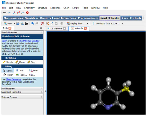 PARTE EXPERIMENTAL Aquisição de estrutura 3D da biomacromolécula a partir do servidor online Protein Data Bank (PDB ID: 5kxi) Ao acessar o domínio https://www.rcsb.org/ na barra de busca, deve-se inserir o código PDB 5kxi.22 Uma vez redirecionado para a página que contém um resumo de informações sobre essa estrutura, o arquivo PDB FORMAT na opção DOWNLOAD FILES pode ser descarregado. Salve o arquivo (5kxi.pdb) em uma pasta criada especificamente para o trabalho. Análise das interações na estrutura cristalográfica com o servidor online PDBsum Para avaliar as interações originais ligante-receptor, presentes na estrutura da biomacromolécula alvo, acesse o domínio http://www.ebi.ac.uk/pdbsum/ digite o código PDB 5kxi e clique em FIND.24 Em seguida, na barra superior, se deve clicar na aba LIGANDS e selecionar o ligante que se deseja obter as interações com o sítio ativo [NCT 402 (A)]. Para descarregar o arquivo *.pdf, contendo tais informações, clique com o botão direito do mouse sobre o símbolo PDF, em seguida clique em salvar link como, e escolha a pasta de trabalho. Avaliação da qualidade da estrutura cristalográfica com o servidor online PROCHECK Acesse o domínio https://saves.mbi.ucla.edu/ Faça upload da estrutura cristalográfica obtida na etapa anterior (5kxi.pdb) e clique em RUN PROGRAMS. Em seguida, selecione a opção PROCHECK25 e clique em START. Ao término do processo, clique em RESULTS. Após exibição dos resultados de análise, clique em RAMACHANDRAN PLOT.26 Nesse momento, devem ser observados os resíduos em regiões permitidas ou "outliers", assim como o percentual de resíduos em cada uma dessas regiões (favoured, allowed and outlier). É possível fazer o download do arquivo *.pdf contendo estas informações clicando no link PDF, localizado acima do gráfico de Ramachandran. Construção de ligantes utilizando o software BIOVIA Discovery Studio Visualizer Abra o software Discovery Studio Visualizer (DSV)27 e crie uma nova janela de trabalho FILE > NEW > MOLECULE WINDOW. Clique na guia SMALL MOLECULES e selecione a opção SKETCH, localizada na guia SKETCH MOLECULES do painel à esquerda da tela de trabalho. Obs.: Para instruções/comandos básicos sobre a construção de moléculas, utilizando o DSV, ver seção material suplementar 2S. Construção da molécula de nicotina