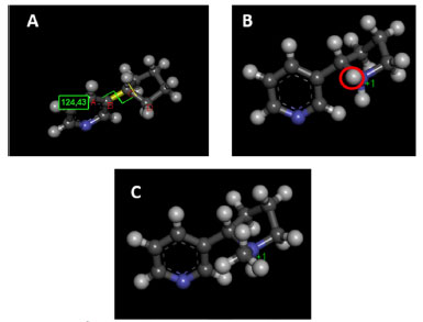 ![]() Figura 2. (A) Átomos envolvidos no ângulo diedro (ângulo de torção) entre os anéis da estrutura proposta. (B) Indicação do átomo de hidrogênio do nitrogênio N8, o qual deverá ser transmutado para carbono (C12) com posterior adição de hidrogênios. (C) estrutura da nicotina resultante