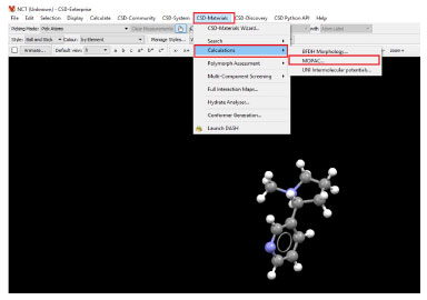 Otimização geométrica do ligante, por meio dos softwares CCDC Mercury e MOPAC2016 O cálculo de otimização geométrica da molécula de nicotina será conduzido em nível semi-empírico, utilizando o pacote MOPAC2016,29 a partir da interface gráfica do software CCDC Mercury.23 Assim, carregue no Mercury, o arquivo NCT.mol2. Para melhor visualização, sugere-se utilizar o estilo "bolas e bastões", selecione DISPLAY > STYLES > BALL AND STICK, na barra de ferramentas. Em seguida, para editar o arquivo de entrada do MOPAC2016, pressione consecutivamente CSD-MATERIALS > CALCULATIONS > MOPAC (Figura 4).