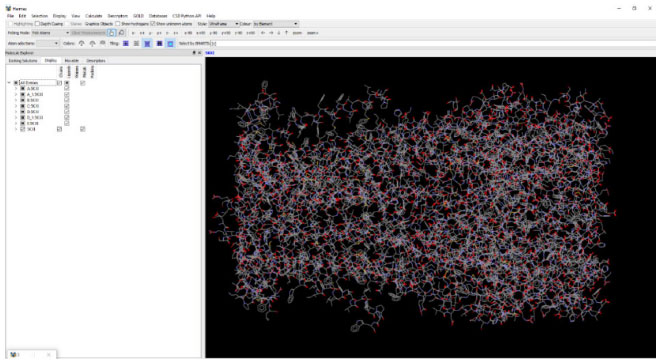 Especiação in silico do estado de protonação do ligante, utilizando o MarvinSketch Abra o software MarvinSketch28 e construa a molécula de nicotina (ver material suplementar, seção 3S). Para simular o estado de protonação da nicotina em pH fisiológico, clique na aba CALCULATIONS > PROTONATION > pKa. Não faça nenhuma alteração na janela que se abre e pressione OK > OK. Selecione e mantenha pressionada a barra de rolagem até encontrar o pH 7,4, considerado como o valor de pH fisiológico padrão para esse tipo de predição. Observe que a micro-espécie mais significativa é a segunda (Figura 3), que corresponde à nicotina protonada no anel pirrolidínico.
