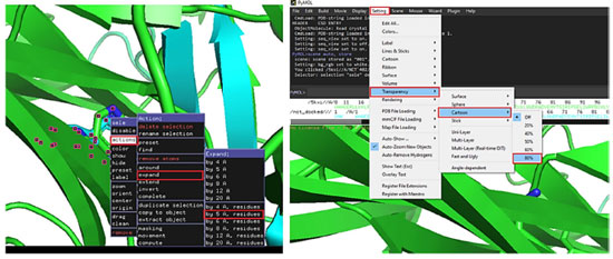 ![]() Figura 14. (Esquerda) Seleção e formatação dos resíduos, em um raio de 5 Å do ligante de interesse. (Direita) Aumento de transparência da estrutura em "cartoon"