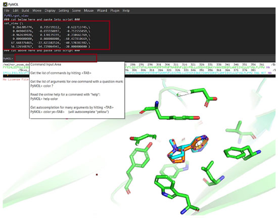 Mantendo os resíduos selecionados, deve ser habilitada a função S, à direita da opção (SELE), optando pela forma STICKS. Uma melhor visualização é adquirida alterando a cor do ligante co-cristalizado em relação aos resíduos previamente expandidos. Nesse sentido, mantenha-o selecionado aplicando em sequência o comando C > BY ELEMENT, escolhendo uma das cores do painel. Aqui, foi escolhida a coloração laranja para os átomos de carbono. Ao mesmo tempo, é sugerido o comando SETTING > TRANSPARENCY > CARTOON > 80%, para melhorar a visualização, conforme mostrado na Figura 14. Antes de completar a edição da figura, podem ser coletadas as coordenadas da pose, segundo a visão atual na tela, com a palavra-chave GET_VIEW, o qual deve ser digitada pelo usuário na linha de comando em frente ao nome "PyMol>", pressionando a tecla Enter ao final do processo, Figura 15.