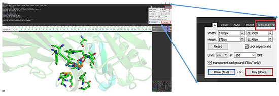 Essas coordenadas podem ser utilizadas, posteriormente, para analisar outros ligantes ancorados, com o mesmo receptor, a partir da mesma orientação. Para realizar esse procedimento, é suficiente colar, Ctrl+V, as coordenadas já coletadas na linha de input dos comandos e pressionar a tecla Enter. As rotinas de A.M. devem ser validadas, sendo a redocagem o método mais utilizado. Nessa abordagem, a estrutura do ligante co-cristalizado da proteína é removido do sítio de ligação. Em sequência, o algoritmo deverá recalcular a orientação e conformação do ligante no bolsão de ligação. Serão considerados protocolos aptos, ou bem sucedidos, caso haja concordância entre o modo de ligação experimental e o calculado. Aqui, a pose de maior pontuação apresentou valor de RMSD = 1,5 Å, isso é, RMSD < 2Å, considerada uma rotina apta para o sistema em questão. Finalmente, para gerar uma figura de alta qualidade, visando relatórios técnicos, artigos, dentre outros, seleciona-se a opção DRAW/RAY > RAY(slow), conforme exemplificado na Figura 16.