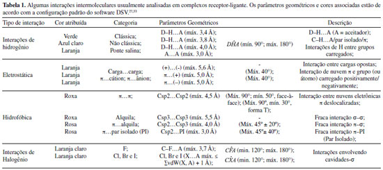 Ressalta-se que essa ferramenta permite inspecionar os complexos obtidos, por cálculos A.M. e aqueles determinados experimentalmente, desde que haja um arquivo de entrada, contendo as coordenadas cartesianas atômicas, no formato *.pdb.4 Na etapa de inspeção, após observar a conformação ativa do ligante, o usuário pode priorizar os contatos não-covalentes mais relevantes. Para tal, habilitando o painel de monitoramento do DSV, a aba NON-BOND permite ao usuário caracterizar as interações presentes no complexo, ao mesmo tempo, verificando quais são os parâmetros geométricos (distância e ângulo) associados. Na Tabela 1, podem ser visualizados alguns parâmetros geométricos, tipo de interação, cor atribuída e categoria das interações favoráveis, habitualmente listadas, em complexos receptor-ligante.