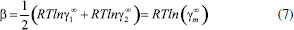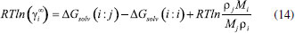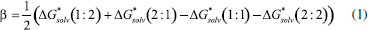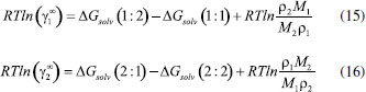 Recentemente, mostrou-se que o processo de separação de fases em sistemas binários pode ser predito por um modelo de solução regular5 utilizando um parâmetro β,26 dado por: ![]() em que o conceito de energia livre de solvatação é inserido. Nessa equação, ΔG*solv (1:2) e ΔG*solv (2:1) são as energias livres do componente 1 em 2 e de 2 em 1, em diluição infinita. Os valores de ΔG*solv (1:1) e ΔG*solv (2:2) são as energias livres de solvatação de cada componente nele mesmo. Como é bem estabelecido na termodinâmica de soluções líquidas binárias,5 a separação de fases ocorre quando a derivada segunda a energia de Gibbs de mistura com relação a fração molar de um dos componentes fica negativa em algum ponto. No caso de solução regular, essa condição é satisfeita quando:5,26 ![]() Fisicamente, isso significa que cada componente terá de ser, na média, mais solvatado na sua fase pura por 2RT em relação a sua solvatação no outro componente. Dessa forma, temos uma visão física clara do fenômeno de separação de fases em termos de interação molecular e do conceito moderno de energia livre de solvatação. No presente manuscrito, o objetivo é estender essa análise do efeito da energia livre de solvatação sobre o comportamento de equilíbrio de fases. Iremos analisar o processo de formação de azeótropos usando novamente o modelo de solução regular, combinado com o conceito de energia livre de solvatação. Para verificar a performance dessa abordagem, foi utilizado um modelo mais completo para calcular o coeficiente de atividade, a equação de Margules de dois parâmetros, que pode ser derivada da expansão de Redlich-Kister da energia livre de mistura.5,7 Os parâmetros desse modelo foram obtidos de dados experimentais de coeficiente de atividade em diluição infinita disponíveis na literatura. Um total de 10 soluções binárias diversas foram investigadas. Deve-se mencionar que o modelo de solução regular tem sido utilizado para discussão geral do equilíbrio de fases.28-30