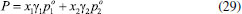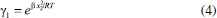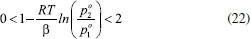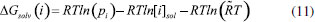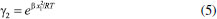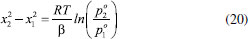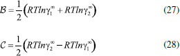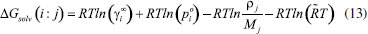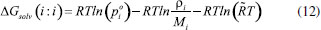 METODOLOGIA Modelo de solução regular A pressão de vapor de um componente i em uma mistura líquida com fração molar xi é dado por: ![]() sendo pio a pressão de vapor do líquido puro e γi o coeficiente de atividade. Usando a equação de Margules de um parâmetro,6 a variação de γi com a composição é dada por: ![]() e ![]() sendo β um parâmetro do modelo, que pode ser associado ao coeficiente de atividade em diluição infinita (γi∞). De fato, fazendo x2 → 1 em 4 e x1 → 1 em 5, fica: ![]() Na realidade, os valores de γi∞ não são usualmente iguais. Sendo assim, para termos uma forma funcional para γi dada por (4) e (5), podemos fazer uma média para obter β, ou seja: ![]() sendo o coeficiente de atividade em diluição infinita médio dado por: ![]() Equações (7) e (8) foram utilizadas para obter β e γm∞. A energia livre de solvatação, como definido por Ben-Naim,10,11 pode ser escrita como a energia livre de partição de um composto i entre as fases gasosa e solução líquida: ![]() No caso de fase gasosa, podemos escrever: ![]() sendo R ~ a constante dos gases em atm.L.K-1.mol-1. Substituindo, fica: ![]() No caso de i sendo solvatado em seu líquido puro, temos: ![]() E no caso de i ser solvatado pelo solvente j, em diluição infinita, fica: ![]() Combinando (12) e (13), teremos: ![]() Considerando os componentes 1 e 2, podemos escrever: ![]() Usando (15) e (16) em (7), teremos: ![]() A equação (17) é a mesma utilizada no estudo do equilíbrio de fases líquido-líquido,26 mas no presente estudo não se fez nenhum pressuposto sobre como ΔGsolv se comportaria com a composição da mistura. Usou-se a forma funcional da equação de Margules de um parâmetro para γi, as equações (4) e (5), e o valor médio de γi∞, dado pela equação (7). As equações (15) e (16) são exatas. Observando as equações (4), (5) e (17), notamos a clara conexão com o modelo de solução regular em que β estaria associado a uma entalpia de mistura.5 No presente modelo, β está relacionado a diferença entre a energia livre de solvatação em diluição infinita e no líquido puro dado por (17). Formação de azeótropo A formação de azeótropo a uma certa temperatura ocorre quando a composição das fases líquida e gasosa são iguais, resultando que:6 ![]() Usando a forma funcional de γi, temos: ![]() Tomando os logaritmos e rearranjando, fica: ![]() e ![]() Essa equação mostra a composição do azeótropo. Isso significa que a fração molar x1 deve estar entre 0 e 1, ou seja, para formar azeótropo, a condição é: ![]() Essa equação leva a duas condições para formar azeótropo, o de pressão total máxima (β > 0) e o de pressão total mínima (β < 0), a seguir: ![]() Essas duas equações foram utilizadas para prever a formação de azeótropo neste estudo. Como pode-se notar, a equação (23) mostra que a formação de azeótropo está relacionada a razão de pressão de vapor entre os componentes e a diferença de energia livre de solvatação, medida por β. Quanto maior a razão da pressão de vapor, menos solvatado deve estar o componente 1 na solução de 2 e reciprocamente para 2 em 1. No caso de (24), é o contrário, uma maior razão de pressão de vapor dos componentes puros implica que o componente 1 deve estar mais solvatado em 2 do que em 1, e similarmente para a solvatação de 2 em 1. Equação de Margules de dois parâmetros Para uma análise mais acurada do equilíbrio líquido-vapor, e poder avaliar graficamente a previsão das equações (23) e (24), foi utilizada a equação de Margules com dois parâmetros para os coeficientes de atividade.6 Essa equação está relacionada com a expansão de Redlich-Kister da energia livre de mistura não ideal,5-7 e preferiu-se utilizar a forma da função relacionada a essa expansão. Nessa abordagem, os coeficientes de atividade são dados por: ![]() e ![]() Os parâmetros B e C são obtidos de pelas relações: ![]() Observe que β da solução regular e B da expansão tem a mesma relação com γi∞. Foi considerado que B e C são independentes da temperatura. A pressão total da mistura é obtida de: ![]() Dados de pi∞ e γi∞ Para a análise de formação de azeótropos, foram utilizados dados de pressão de vapor dos componentes puros (pio) obtidos do NIST31 pela equação de Antoine, e dados de γi∞ de 10 misturas obtidos da literatura.25,32,33 A tabela completa dos dados está em material suplementar.