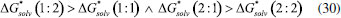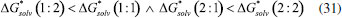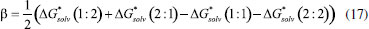 A primeira mistura é clorofórmio-metanol, que tem um alto desvio da idealidade (β = 4,06 kJ mol-1) e forma um azeótropo em X1 = 0,64 a 330 K, conforme mostra o gráfico e de acordo com a equação (23). Do ponto de vista de ΔGsolv, os dados mostram que é a variação da energia livre de solvatação do metanol indo do líquido puro à solução de clorofórmio que gera o maior desvio da idealidade. Já na segunda mistura, clorofórmio-acetonitrila, a variação de ΔGsolv é pequena para ambos os solutos, resultando num pequeno β de 0.6 kJ mol-1 e não havendo formação de azeótropo, de acordo com equação (23). Na terceira mistura, clorofórmio-tetraidrofurano, ambos os componentes são mais solvatados no outro componente do que a correspondente auto-solvatação, resultando em um β negativo por-3,54 kJ mol-1 e satisfazendo (24). Como consequência, há formação de um azeótropo negativo conforme mostra a Figura 2. A quarta mistura é água-metanol, que tem um modesto desvio da idealidade e não forma azeótropo. A quinta mistura, água-piridina, tem um forte desvio da idealidade e satisfaz facilmente a equação (23), formando um azeótropo. Ambos os componentes são mais solvatados nos seus líquidos puros do que no outro componente. Já a sexta mistura, nitrometano-benzeno, também tem um substancial desvio da idealidade, mas o termo |RTln(p2/p1)| é substancial e próximo de β, de forma que o azeótropo é menos bem caracterizado do que os demais. Ambos os componentes contribuem para o valor de β devido a variação de ΔGsolv. Nas duas misturas subsequentes, dietilamina-clorobenzeno e dietilamina-hexano, ambas têm um valor pequeno de β, sendo que os componentes apresentam solvatação muito similares no líquido puro e em diluição infinita no outro componente. Como resultado, não formam azeótropos. A nona mistura, etanol-éter etílico, tem um desvio substancial da idealidade, com β = 2,70 kJ mol-1, mas não forma azeótropo pela equação (23) a 310 K pelo fato de que |RTln(p2/p1)| é muito grande, o que é experimentalmente verificado, assim como é verificado pelo modelo usando a expansão de Redlich-Kister. A décima e última mistura, acetona-metanol, forma azeótropo como mostra a equação (23) e o gráfico na Figura 2. Nota-se que β é levemente acima de |RTln(p2/p1)|, e o gráfico é de um azeótropo pouco acentuado. Em termos de ΔGsolv, é o metanol que mais contribui para o desvio da idealidade ao ir de seu líquido puro para a solução de acetona. Em resumo, todas as 10 misturas analisadas aqui pelas equações (23) e (24) estão de acordo com dados experimentais de formação de azeótropo, suportando a aplicação dessas relações e sua interpretação em termos de variação de energia livre de solvatação. Recentemente, Roese e colaboradores24 propuseram uma relação simples para prever formação de azeótropos, usando energia livre de solvatação. Pelo critério daqueles autores, o azeótropo seria formado ao satisfazer simultaneamente as equações: ![]() ou ![]() Observando os dados da Tabela 1, vemos que esses critérios falham nas misturas 7, 8 e 9. Dessa forma, os critérios estabelecidos neste artigo são mais acurados.