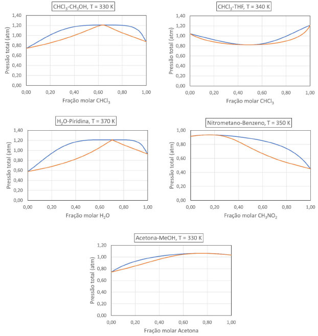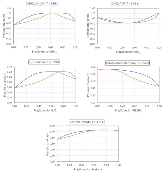 ![]() Figura 2. Diagramas de fases líquido-vapor das soluções que formam azeótropos obtido pelas equações 25 a 29