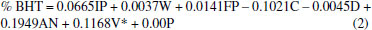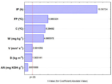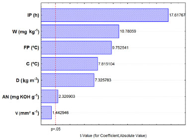 According to the Pareto diagram (Figure 1), the mathematical model of the BHA has as its most significant term the induction period followed by the flash point, cloud point, water content, viscosity, density and acid number. It is observed in equation 1 that the increase in IP, FP and W cause an increase in the BHA mass, and an increase in C, V, D and AN cause an antagonistic effect. The highest significance degree attributed to the variable IP demonstrates the importance of this term to determine the antioxidant mass. The smaller impacts of the other variables only demonstrate their lower contribution to the final value of the mass, but with 3 of them, within the limit to be considered significant. The parameters viscosity (p = 0.056), density (p = 0.070) and acid number (p = 0.380), contribute negatively, which would be desirable, as they cause a reduction in the BHA mass. However, they do not contribute significantly, presenting less impact on the final mass value of the BHA antioxidant, especially AN. The data of the mixtures with the antioxidant BHT, present in Table 2, were tabulated and presented to the multiple regression module of the software Statistica v.13.1.32 The multiple regression equation obtained, without intercept, containing the eight independent variables is shown in equation 2, where the dependent variable represents the mass percentage of BHT. The asterisk term indicates that it is not significant at the 5% level. The P coefficient was equal to zero showing that the influence of this parameter in the BHT mass estimation is null. ![]() Figure 2 contains the Pareto diagram, which shows the most significant variables in the mathematical model obtained.