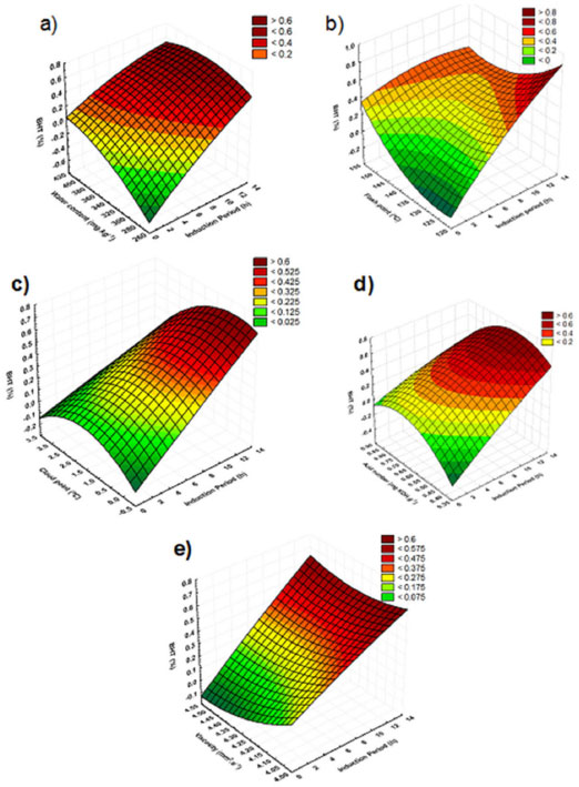 ![]() Figure 3. Response surfaces relating the BHA mass and induction period with flash point (a), cloud point (b), water content (c), viscosity (d) and acid number (e)