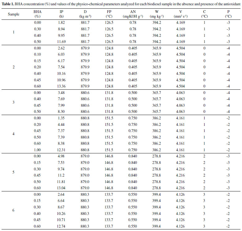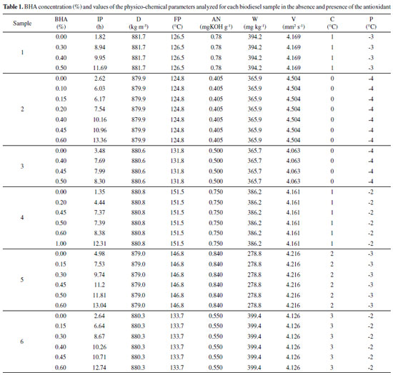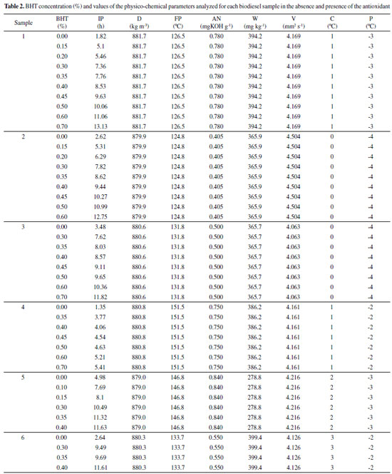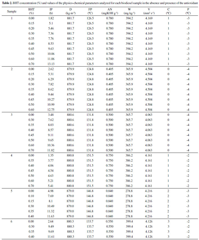 CONCLUSIONS Establishing predictive mathematical models, which use the physical-chemical parameters normally analyzed in the manufacturing industries, proved to be of great use in assessing the amount of antioxidant BHA or BHT that must be added to biodiesel, so that it reaches, at least, the minimum value of the induction period established by the regulatory agencies, before being commercialized. In addition, it allows to diminish possible excesses in the use of the additive reducing the biodiesel production cost.