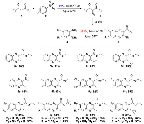 Li e colaboradores desenvolveram uma cascata linear e simultânea catalisada por hemoglobina de sangue bovino (HbBv) e lipase de pâncreas suíno (PPL) para a produção de quinoxalinas (Esquema 1).15 Diferentes quinoxalinas foram obtidas a partir de uma reação tricomponente envolvendo compostos 1,3-dicarbonílicos (1), sulfonil azidas (2) e 1,2-diaminas (3).