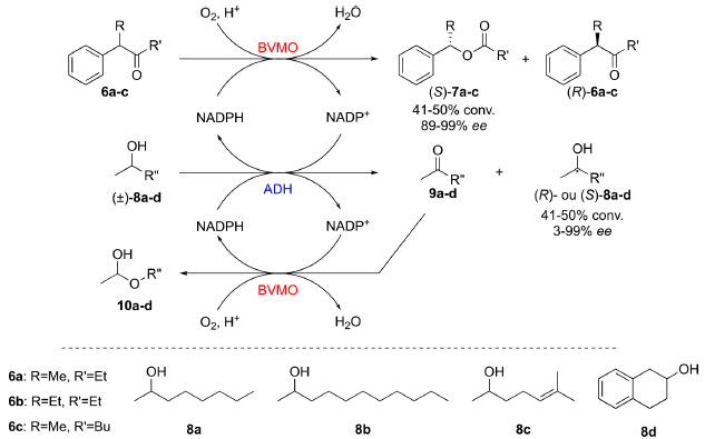![]() Esquema 2. Cascata paralela utilizando BVMO e ADH para a obtenção de cetonas e álcoois enantiomericamente enriquecidos