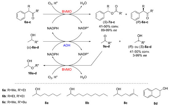 Rioz-Martínez e colaboradores desenvolveram uma metodologia de cascata paralela em que uma oxidação catalisada por uma enzima do tipo Bayer-Villiger monooxigenase (BVMO) ocorre paralelamente à uma resolução cinética catalisada por uma enzima álcool desidrogenase (ADH). Conectadas pela regeneração do cofator NADPH/NADP+, as reações permitiram a obtenção satisfatória de cetonas e álcoois enantiomericamente enriquecidos (Esquema 2).16 Variantes desta cascata puderam levar à formação de sulfóxidos enantiomericamente enriquecidos.16