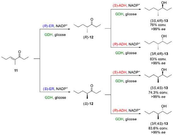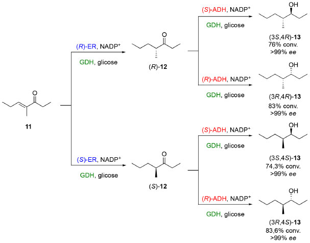 ![]() Esquema 3. Cascata ortogonal para a obtenção dos quatro estereoisômeros do 4-metil-heptan-3-ol a partir de 11 catalisada pelas enzimas ER, ADH e GDH