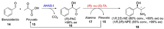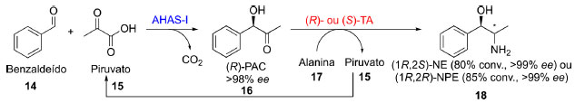 Desta forma, Sehl e colaboradores desenvolveram um sistema em cascata cíclica para a obtenção da (1R-2S)-norefedrina e (1R,2R)- norpseudoefedrina, ambos enantiomericamente puros (Esquema 4). Na primeira etapa ocorreu a descarboxilação do piruvato (15) catalisada por uma liase (AHAS-I) e o acetaldeído recém gerado sofreu uma condensação aldólica com o benzaldeído (14) formando o intermediário (R)-fenilacetilcarbinol (16) que não foi isolado e serviu como material de partida para a enzima ω-transaminase (R) ou (S) seletiva catalisar a reação de aminação redutiva e consequente formação de (18). Neste caso, a escolha perspicaz da alanina (17) como doador de grupo amino permitiu que o subproduto da aminação redutiva fosse o piruvato (15), reciclando assim este reagente utilizado na primeira etapa da cascata.18