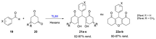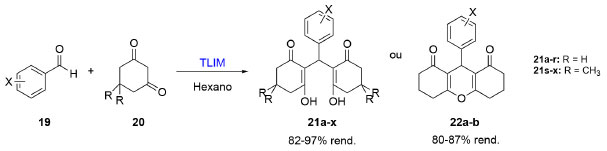![]() Esquema 5. Síntese de derivados de xantona (21 e 22) em cascata a partir de reações (19) e (20) catalisadas por um único catalisador, a enzima TLIM