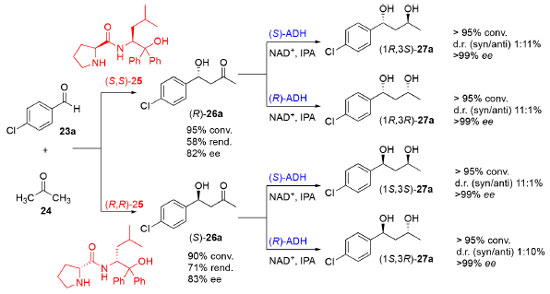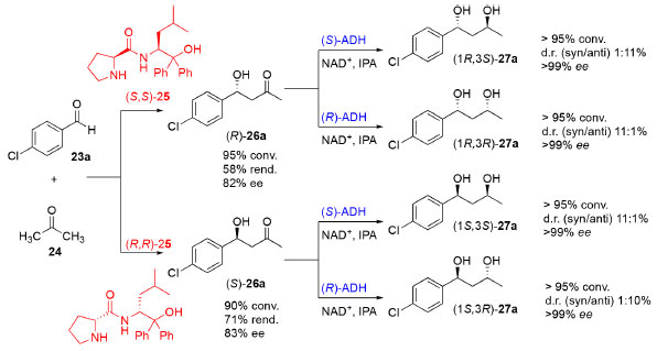 Como estratégia de desenvolvimento deste trabalho, os autores investigaram a segunda etapa da reação em cascata, a fim de avaliar a atividade enzimática de duas ADH (R) e (S) específicas utilizando o intermediário racêmico β-hidroxicetona (26a) como substrato. O objetivo deste estudo foi investigar a tolerância de cada enzima às duas formas enantioméricas bem como a influência da presença de um centro assimétrico. Como resposta ao emprego da (S)-ADH foi demonstrada a efetividade desta enzima para a redução quantitativa do grupo cetona de 26a em sua forma racêmica, demonstrando que, além de admitir os dois enantiômeros como substrato, a atividade enzimática não foi afetada pela presença do centro assimétrico já que os estereoisômeros foram obtidos em suas formas enantiomericamente puras (ee> 99%). O mesmo comportamento foi observado para a (R)-ADH. Com a segunda etapa da reação em cascata bem definida, os pesquisadores se voltaram então para a otimização da primeira etapa responsável pela formação dos produtos aldol quirais ((R)-26a) e ((S)-26a) enantiomericamente puros, em uma síntese sem solventes. Utilizando os organocatalisadores (25) com configuração (S,S) e (R,R), à temperatura ambiente, foi possível obter as β-hidroxicetonas ((S)-26a) e ((R)-26a) com conversões de 90 e 95% e ee de 83 e 82%, respectivamente. Uma vez constatada a viabilidade de cada um dos catalisadores para o acesso aos quatro enantiômeros separadamente, partiu-se para a investigação de compatibilidade entre o organocatalisador (25) e as enzimas ADH, cujos resultados permitiram à conclusão de que a atividade das enzimas não foi afetada consideravelmente pela presença do organocatalisador (Esquema 7). Assim, o estereoisômero de interesse (1R,3S)-27a foi sintetizado por meio de uma cascata quimioenzimática com uma conversão global de 95% e com ee>99%.