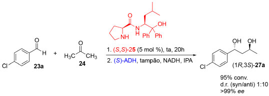 ![]() Esquema 6. Cascata quimioenzimática utilizando um organocatalisador (25) e enzimas (ADH) para obtenção de 1,3-diois quirais