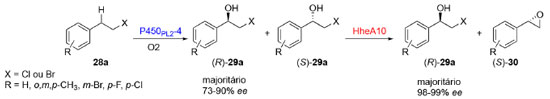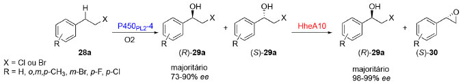 CASCATAS BI- OU MULTIENZIMÁTICAS Nesses casos, todas as etapas das cascatas utilizam biocatalisadores. A seguir serão apresentados três exemplos, cada um focando na síntese de produtos com aplicações distintas e classes enzimáticas diferentes, a fim de ilustrar a abrangência deste tipo de cascata. O primeiro exemplo envolve a formação de β-haloidrinas. As transformações em grupos funcionais de β-haloidrinas são conhecidas por permitir a obtenção de aminoalcoois, hidroxinitrilas e dióis, que por sua vez são substratos úteis para a síntese de compostos de interesse comercial, como agroquímicos, compostos farmacêuticos e produtos naturais, dentre outros.26 Diversas metodologias para a obtenção de β-haloidrinas já foram descritas contando, contudo, com aspectos desafiadores quanto aos rendimentos.27-31 Cui e colaboradores desenvolveram uma reação em cascata para a obtenção de β-halohidrinas (29a) a partir de β-haloalcanos (28a), utilizando uma enzima tipo monooxigenases do citocromo P450 e uma enzima do tipo halohidrinas desidrogenases (HHDH). As enzimas monooxigenases P450 são capazes catalisar a inserção de um átomo de oxigênio em ligações C-H não ativadas sob condições reacionais mais brandas enquanto as enzimas haloidrinas desidrogenases são responsáveis por catalisar a desalogenação de halohidrinas. A combinação destas duas enzimas resultou na formação dos correspondentes β-haloidrina (29) e epóxido (30) a partir do haloalcano (28) (Esquema 8).32-36 Aqui, a enzima HHDH altamente enantiosseletiva foi fundamental para melhorar os valores de excessos enantioméricos obtidos na transformação anterior, promovida pelas P450.37