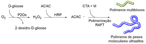 ![]() Esquema 9. Esquema geral do sistema em cascata bienzimática utilizando as enzimas P2Ox e HRP para catalisar reações de polimerização radicalares