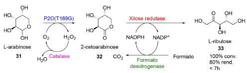 Para a etapa de oxidação, a piranose-2-oxidase (P2O) foi adotada como enzima potencialmente viável, visto que dados disponíveis na literatura sobre um tipo selvagem de P2O relatam transformações eficientes em hexoses como a D-glicose.43 Dessa forma, a enzima P2O foi modificada geneticamente visando melhorar sua atividade frente à L-arabinose, gerando uma gama de P2O mutantes, cujas atividades foram investigadas, resultando na seleção da variante P2O (T169G) como sendo a mais ativa entre as obtidas. Os resultados sugerem que a oxidação promovida pela P2O (T169G) é dada em uma etapa única, com taxa de conversão da L-arabinose em 2-cetoarabinose 40 vezes superior quando comparada com a reação catalisada pela P2O selvagem, além de uma eficiência catalítica 13 vezes maior, em menor tempo reacional.55 Após os resultados promissores para a obtenção da 2-cetoarabinose (32) promovida pela P2O (T169G), a etapa seguinte envolveu a redução em C1 para a formação da L-ribulose (33). Para isso, selecionou-se como segundo biocatalizador a xilose redutase de Hypocrea jecorina, cuja atividade é dependente da presença do cofator NADPH.56 Assim, a fim de garantir a disponibilidade do cofator em sua forma reduzida para manter a atividade enzimática, a redução de 32 foi acoplada a uma terceira enzima, a formato desidrogenase. Baseando-se ainda na demanda de uma concentração constante de oxigênio para a plena atividade da P2O (T169G), uma quarta enzima, a catalase, também foi acoplada ao sistema visando a remoção do subproduto H2O2 gerado pela transformação da primeira etapa. Dessa forma, desenvolveu-se uma cascata multienzimática empregando quatro enzimas simultaneamente. Utilizando este sistema foi possível, em menos de 7h reacionais, obter a L-ribulose com 100% de conversão e cerca de 80% de rendimento. Diante dos resultados que apontam um rendimento elevado em comparação à outras metodologias, atuação em condições reacionais brandas e sem a formação de subprodutos fica constatada a eficiência desse sistema para a obtenção da L-ribulose.