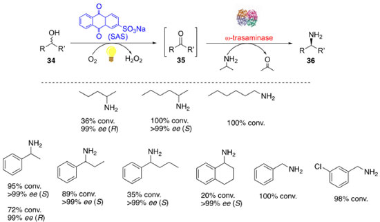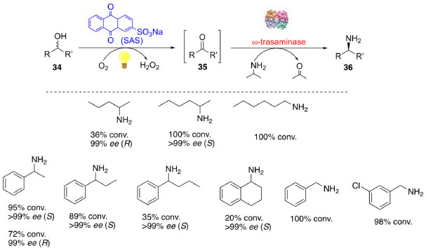 CASCATAS FOTOENZIMÁTICAS No campo da química verde, as reações fotocatalisadas tem recebido uma atenção particular e a implementação da luz para dirigir reações de cascatas enzimáticas e quimioenzimáticas abrem uma janela de possibilidades para a química sustentável. Entretanto, existem alguns obstáculos a serem superados nestas aplicações, principalmente a incompatibilidade entre o biocatalisador e o fotocatalisador.57 Visando mostrar o potencial de abrangência de reações em cascatas catalisadas fotoenzimaticamente, abordaremos a seguir dois exemplos, uma cascata quimioenzimática e uma cascata totalmente enzimática. Gacs e colaboradores desenvolveram uma cascata fotoquimioenzimática para a síntese de aminas enantiomericamente puras (36) a partir de álcoois racêmicos (34), como apresentado no Esquema 11.58 Nessa síntese foram empregadas duas abordagens de cascata one-pot, uma simultânea e a outra sequencial, combinando uma reação de oxidação de álcoois mediada por luz e uma aminação redutiva biocatalítica. Para a etapa de oxidação foram triados vários fotocatalisadores e o organofotocatalisador SAS (do inglês, Sodium Anthraquinone Sulfate) foi selecionado para a conversão de rac-1- feniletanol em acetofenona. Para a reação de aminação redutiva foram selecionadas duas enzimas do tipo ω-transaminase, sendo uma (R) seletiva isolada de Aspergillus terreus (ATωTA) e a outra (S) seletiva isolada de Bacillus megaterium (BMωTA).
