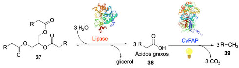 ![]() Esquema 12. Cascata fotoenzimática utilizando lipase e CvFAP para a obtenção de alcanos a partir de lipídeos