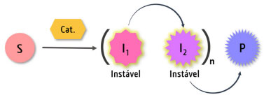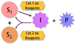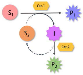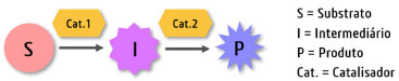 ![]() Figura 1. Representação esquemática geral para cascata linear. No caso de reações em cascata dominó, quando o catalisador apresenta múltiplas atividades ou ainda o substrato possui a mesma funcionalidade repetidas vezes é necessário apenas o catalisador 1