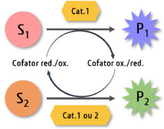 Cascata ortogonal Similarmente à cascata paralela, trata-se de um sistema onde pelo menos duas transformações de compostos distintos ocorrem de maneira acoplada (Figura 3). Contudo, nesse caso a reação lateral ocorre somente como auxiliadora na promoção da transformação principal. Exemplos clássicos de cascatas ortogonais são dados através da utilização de enzimas que demandam de co-substratos (como moléculas doadoras de grupos funcionais) ou dependentes de cofatores que são regenerados por uma segunda enzima.