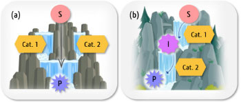 Quando se emprega mais de um catalisador, outro fator de classificação de reações em cascatas é a cronologia em que os reagentes são adicionados ao meio reacional e, consequentemente as reações são promovidas. Pode-se dizer que reações em cascata simultânea (Figura 7a) são consideradas mais sofisticadas, visto que as transformações se processam com a adição de todos os reagentes ao mesmo tempo. Contudo, nem todas as reações podem se adequar a esse tipo de sistema porque, para isto, os componentes reacionais devem ser integralmente compatíveis. Um dos obstáculos é a competitividade entre as reações, tornando um catalisador inativo frente ao intermediário já transformado anteriormente pelo primeiro catalisador. Esse efeito pode ser observado especialmente quanto à utilização de enzimas com especificidade de substratos reduzida, que acabam por ter sua atividade enzimática diminuída ou mesmo completamente suprimida pela presença de grupos funcionais adjacentes próximos à região de transformação do substrato, seja por efeitos estéricos ou eletrônicos. Em cascatas quimioenzimáticas, o efeito de supressão catalítica pode ser observado também através da própria presença do catalisador químico ao meio em que a enzima está contida, podendo provocar a desnaturação da estrutura enzimática.