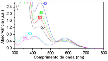 ![]() Figura 1. Espectros eletrônicos da mistura Cr2O72-(aq) com mistura binária água-etanol (40-65%) em meio ácido - após 1 hora de reação