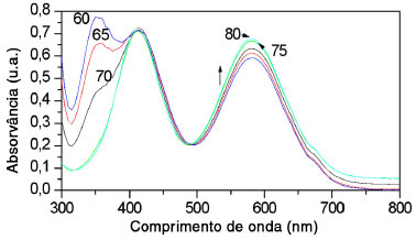 ![]() Figura 2. Espectros eletrônicos da mistura Cr2O72-(aq) com mistura binária água-etanol (60- 80%) em meio ácido - após 1 hora de reação